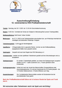 Alle Teilnehmer:/in waren mit großem Einsatz dabei. Die Freude auf das letzte Turnier des Jahres am 21.11.2025 stand allen in`s Gesicht geschrieben. Hier ist ein spannender Kampf um den Jahresgesamtsieg und den Wanderpokal des RSV Merseburg zu erwarten.